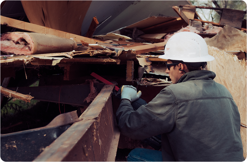 Everything leaves the site. Roofing, insulation, drywall, flooring, plumbing, fixtures, wiring, we sort materials and recycle over 70% of what we remove. Tracked dump receipts on every load.